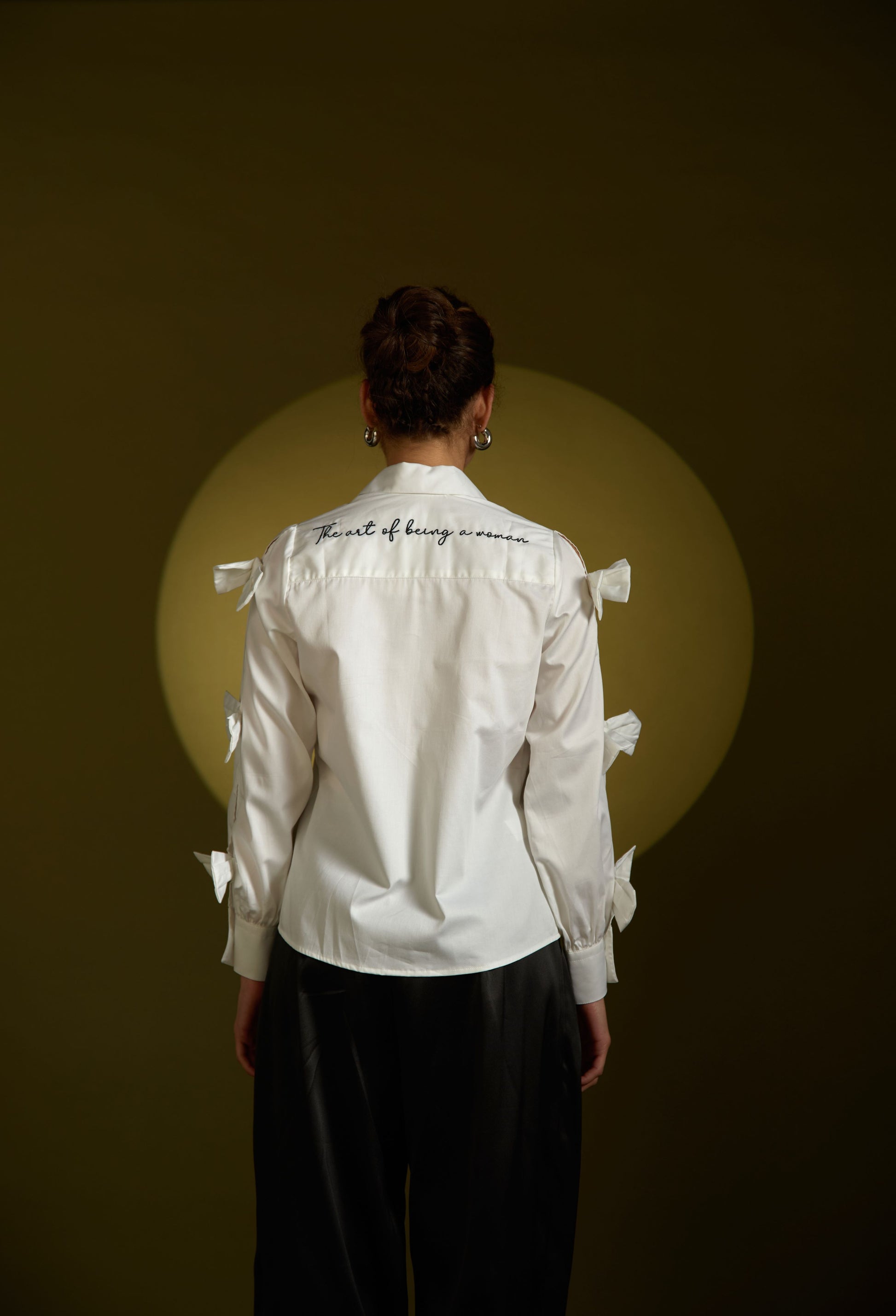 Camisa manga larga en 100% algodón color blanco, con moños en los brazos, silueta standard con bordado en la espalda "The art of being a woman" color negro.