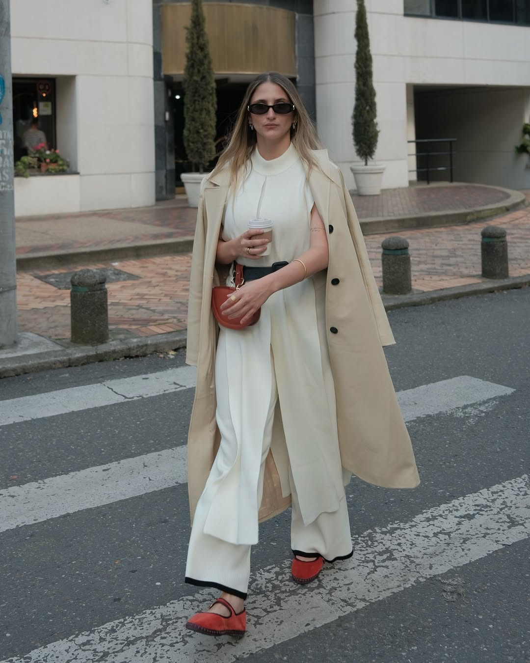 Sobre todo en tejido de punto, largo con abertura en el delantero y laterales (Se puede usar con la abertura en la espalda), cinturon en tejido de punto color Vino.