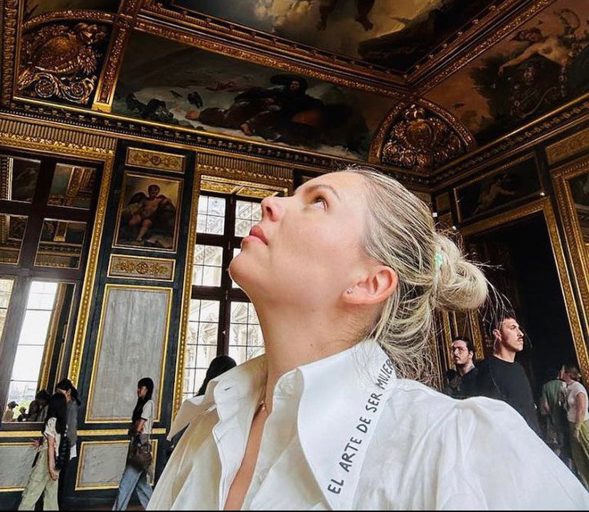 Camisa manga larga en popelina 97% algodón y 3% spandex color blanco, con cuello largo, silueta standard con estampado en el cuello "Arte de ser mujer" color negro.