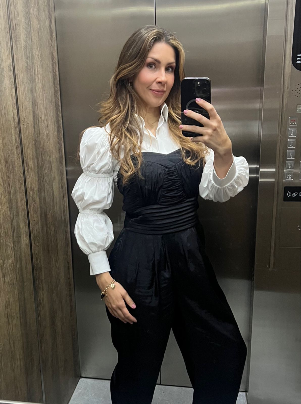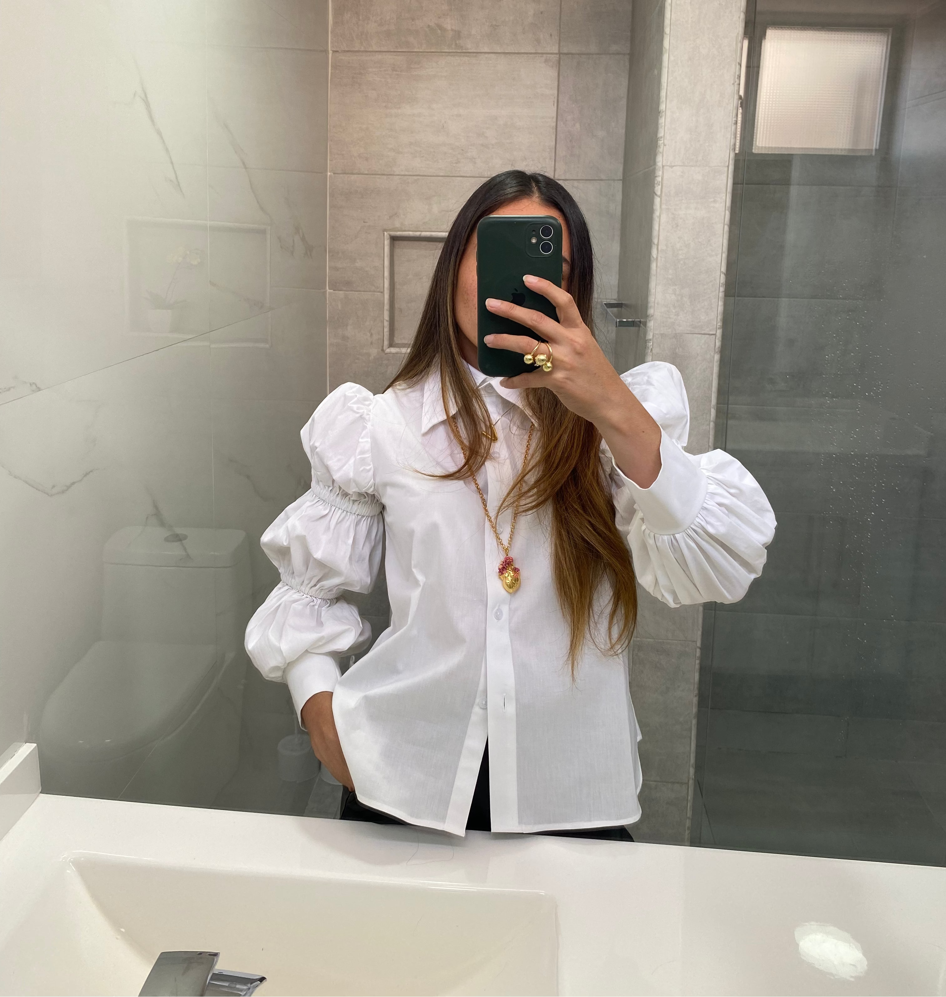 Camisa manga larga, con mangas abombadas, en 97% algodón y 3% spandex, con bordado "arte de ser mujer" color negro en la parte baja de la espalda.