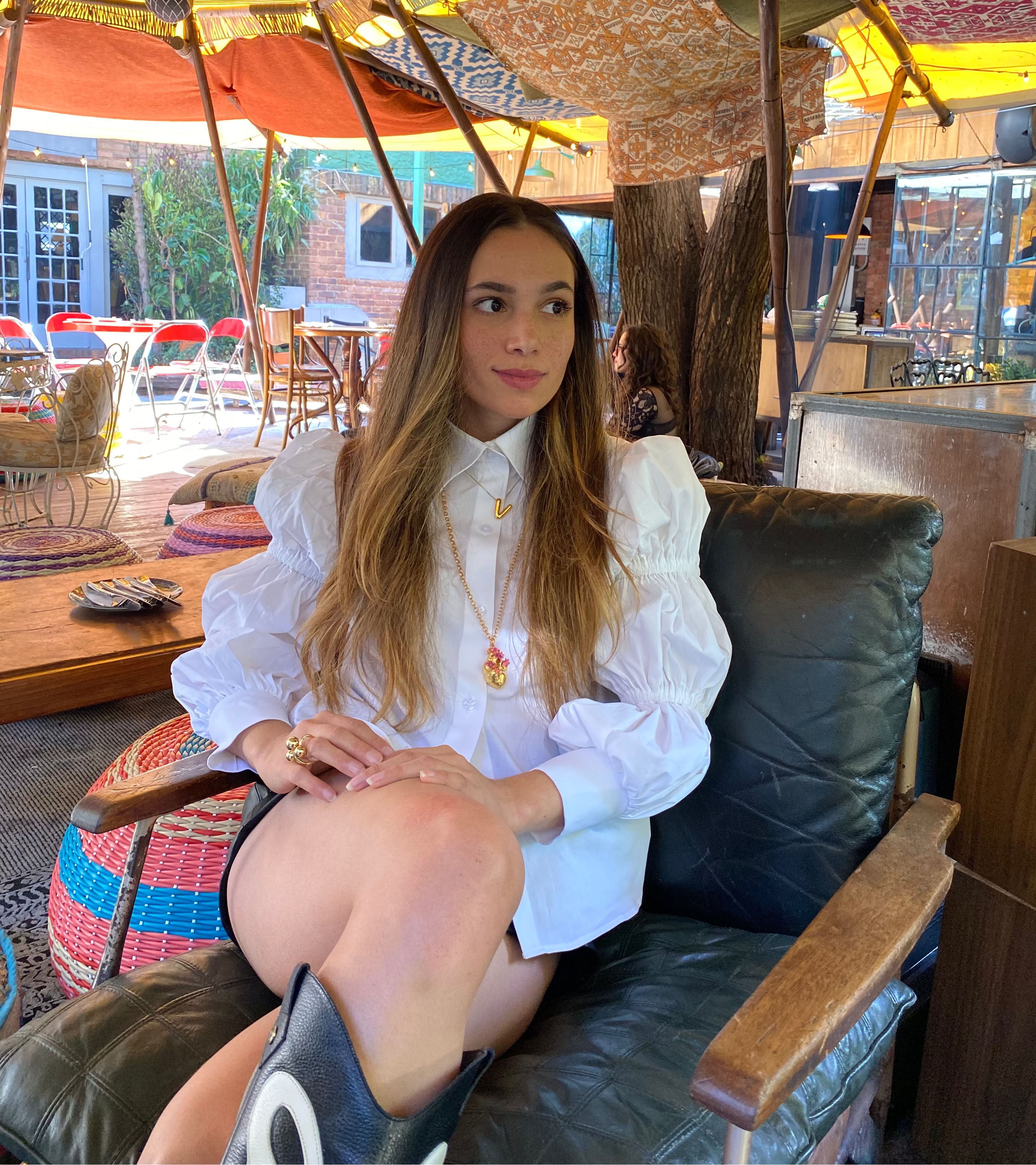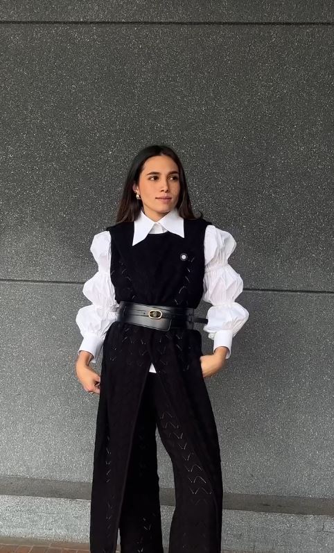 Sophia mide1,80 m y está usando una camisa talla M.